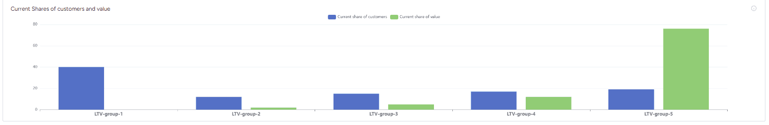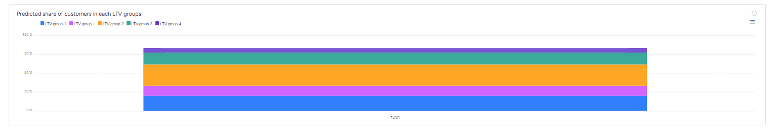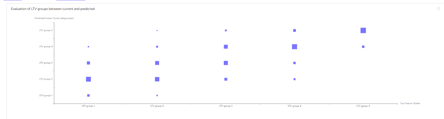 By dividing your customers into classes from the available data, you can see how many of your customers are in which CLV group and the current lifetime value of that group. For example, although there are many customers in CLV group 1, their lifetime values are very low; However, when we look at CLV group 5, you can make comments such as, although there are few customers, their current lifetime values are quite high. You can also look at the estimated distribution of your customers in future groups.